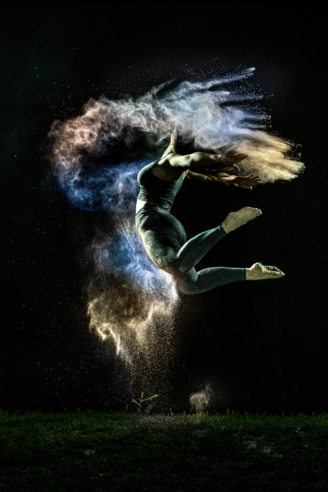 Ein kräftiger Sprung in die Luft, viel Mehl, Puderzucker o.ä. und eine sehr effektvolle Beleuchtung. Ein dynamische Installation und ein gutes Foto dazu.