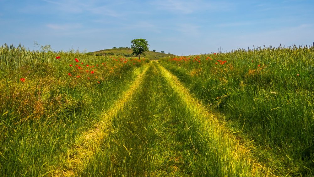 Dieser Spur mag man gerne folgen, eintauchen in das saftige Grün, so wie du es mit deiner tief angesetzten Zentralperspektive vormachst, Hartmut. Die Ränder der Kornfelder, gesäumt von den Farbtupfern des Klatschmohns, sind wie eine zweite Spur, hinein in den Sommer. Hier stimmt einfach alles, einschließlich der erzeugten Vorfreude auf den Wonnemonat Mai.