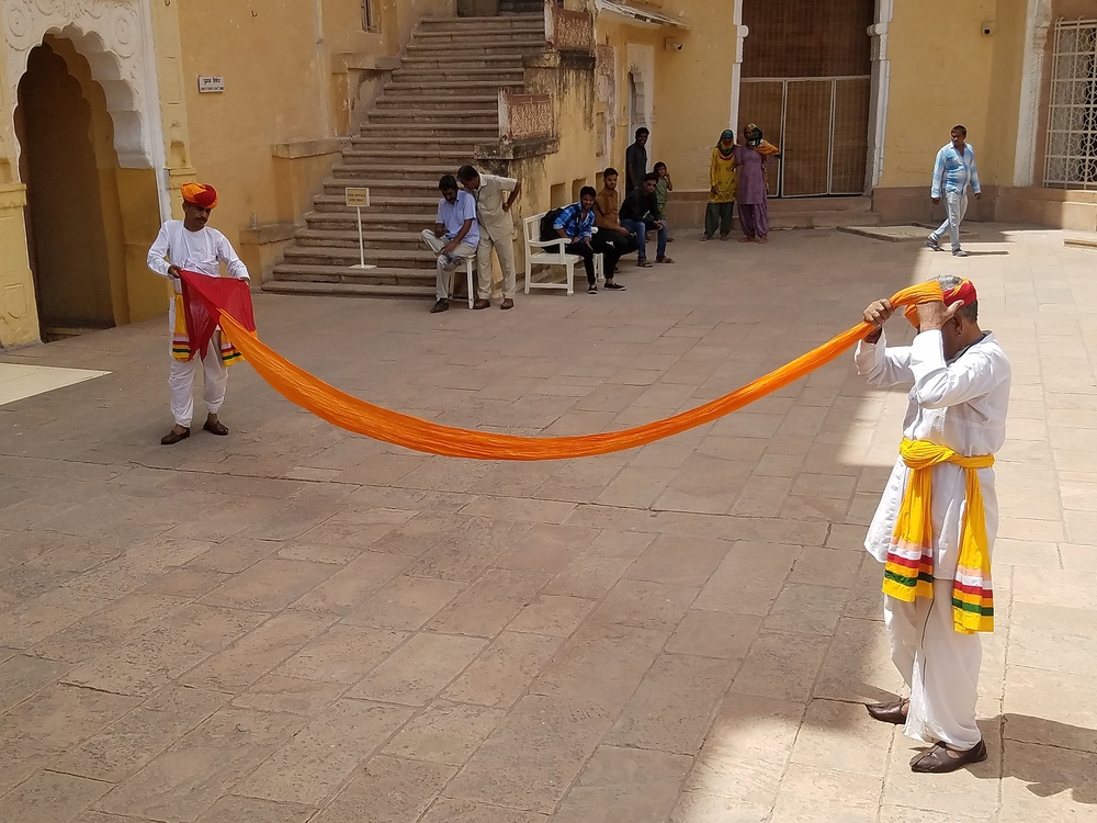 Das Foto zeigt den Anfang der Wickelprozedur. Ein bis zu 10 m langes Tuch um den Kopf zu  einem Turban zu formen ist nicht ganz so einfach. Im Foto sieht man einen „Gehilfen“, der das Ende hält. Ist man alleine zu Hause, behilft man sich auch schon mal mit der Türklinke, an der das Ende befestigt wird. Kein Scherz.