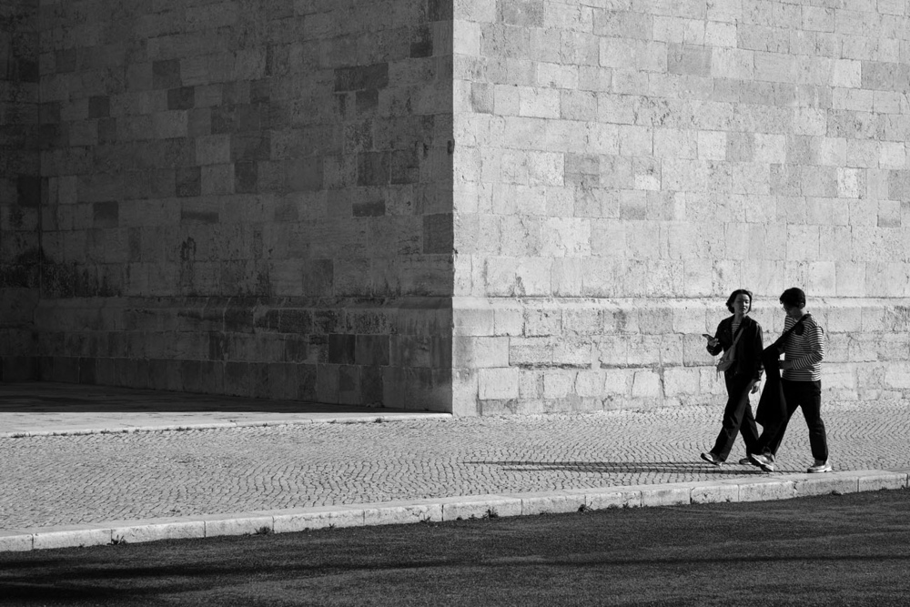 In Lissabons Vorort Belem spazieren zwei Touristinnen vor einer Kirche durch und schaffen eine perfekte Ergänzung zum Schattenspiel.