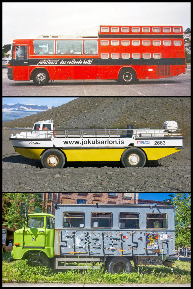 "Das rollende Hotel" entdeckte ich auf einem Parkplatz in St. Ives (Südengland). Mit dem Amphibienbus schipperte ich durch das isländische Treibeis. Der LKW IFA W 50 des VEB Fahrzeugbau Ludwigsfelde steht im Kulturquartier der Alten Baumwollspinnerei Leipzig und diente zu DDR-Zeiten in dieser Variante zu zivilen Personentransporten z.B. in der Landwirtschaft. Als Gefangenentransporter war er ungeeignet.
