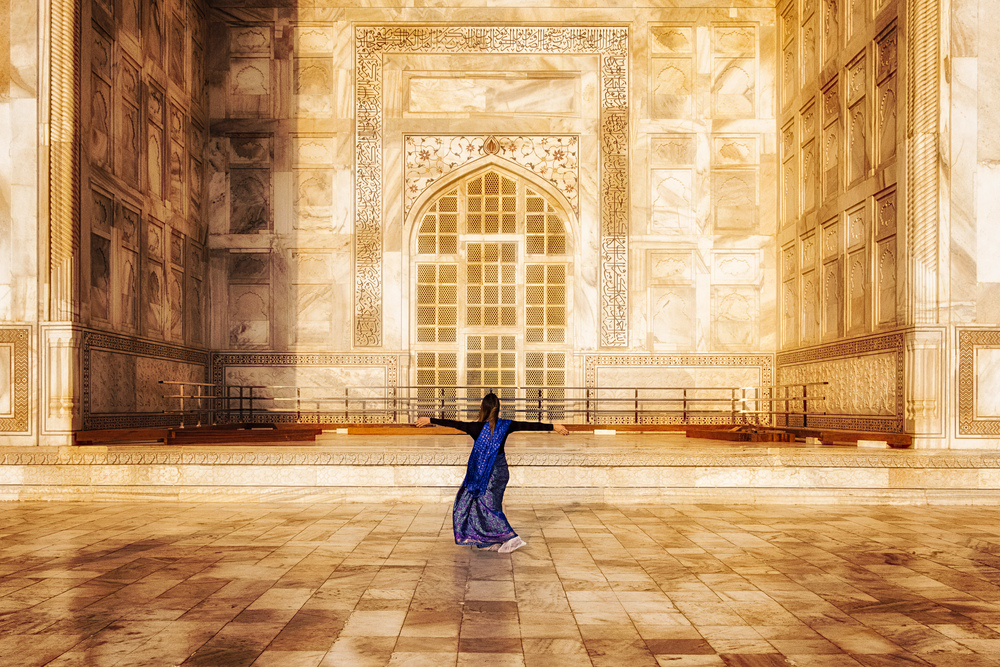TajMahal mit Tänzerin. Ein enger Bildausschnitt im / am Gebäude, die warmen Farbtöne des Gebäudes und der harte Kontrast dazu durch die tiefblaue Bekleidung der Tänzerin. Sie - die Tänzerin - ist der zentrale Blickpunkt in diesem Bild. Gefällt mir sehr gut.