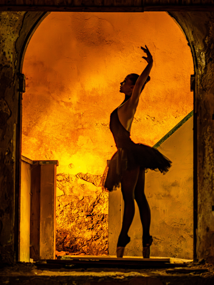 01.06.2025Das ist ein Bild, an dem mein Blick hängen bleibt. Die Tänzerin mit ihrer Grazie im Vordergrund einer Ruine, die wie in Feuersbrunst erstrahlt...