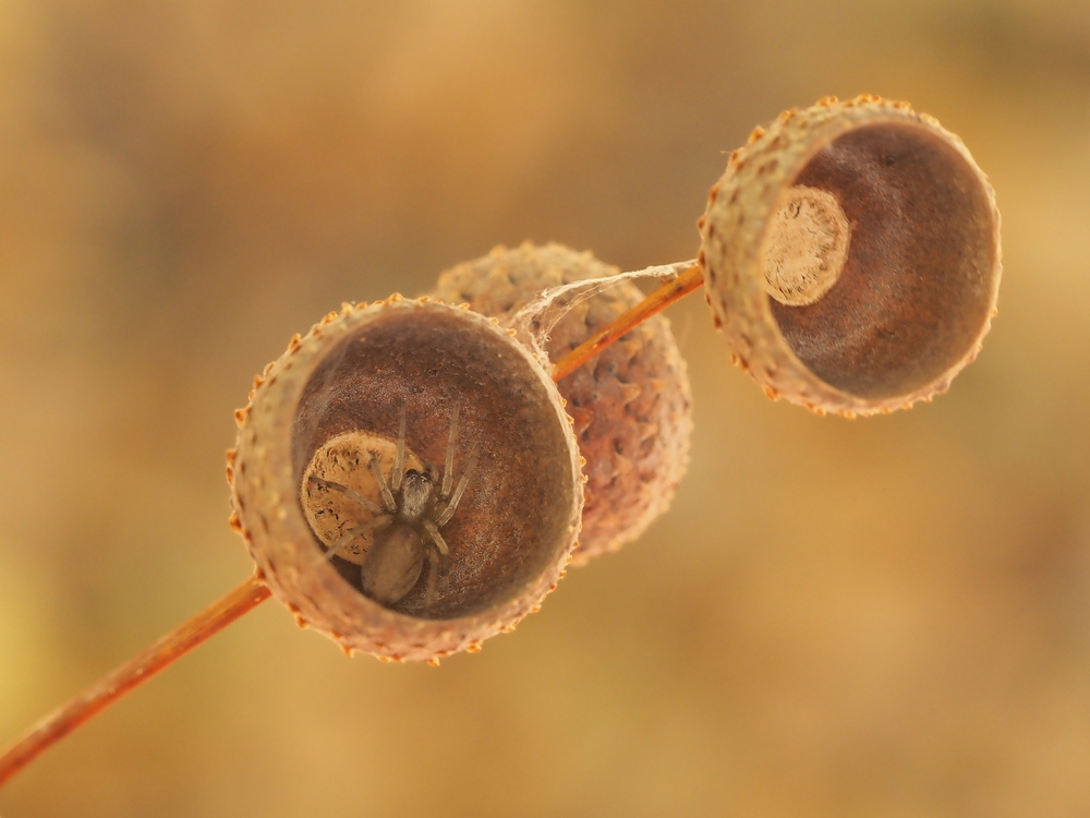 Das ist eine Sackspinne der Gattung Clubiona, die sich Wohngespinste an geeigneten Orten spinnen. Welche Art, ist nach dem Foto nicht bestimmbar. Die Eichelhütchen sind da perfekt, weil sehr stabil. In der Regel falten die Spinnen Blätter zu Wohnsäcken zusammen. Das sind nie Beutefangnetze sondern einfach Schutzgespinste. Sackspinnen jagen ohne Netz meist nachts umherstreifend.