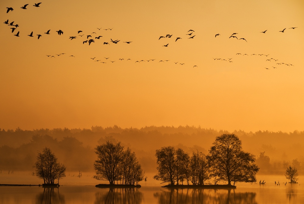 08.11.2025Richtigerweise hast du das gedämpfte Licht genutzt. Ein Bild mit einer fantastischen Atmosphäre ist so entstanden. Sehr schön auch die unterschiedlichen Ebenen im Bild. Oben am Himmel die Kraniche, unten die Bäume im Wasser, noch deutlich und klar zu sehen. Top!