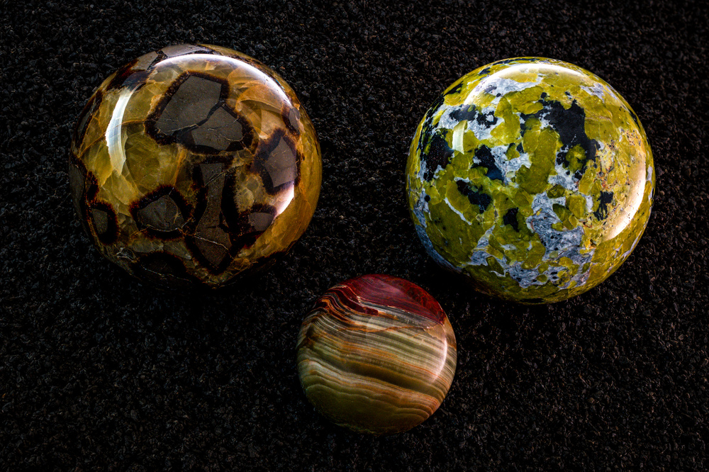 Wunderschöne Steinkugeln, die da auf dunklem Grund zum Glänzen gebracht wurden. Die Farben der drei Steine sind verbindend, da in jedem auf seine Art Gelb vorkommt. Die Formen wiederum sind sehr individuell.