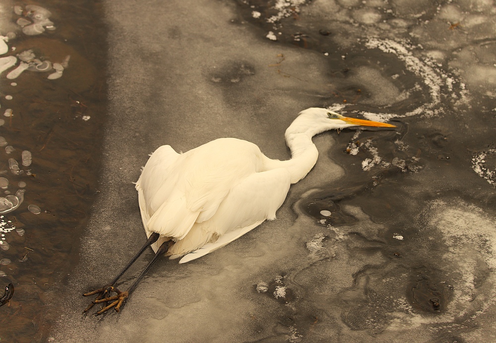 Aber konstant zweistellige Minustemperaturen setzen allen Tieren gewaltig zu, am gestrigen Tag habe ich erstmalig einen verendeten Silberreiher ( lat. Ardea alba ) am offenen Wasser gefunden, mein erster Fund dieses eleganten Fliegers.