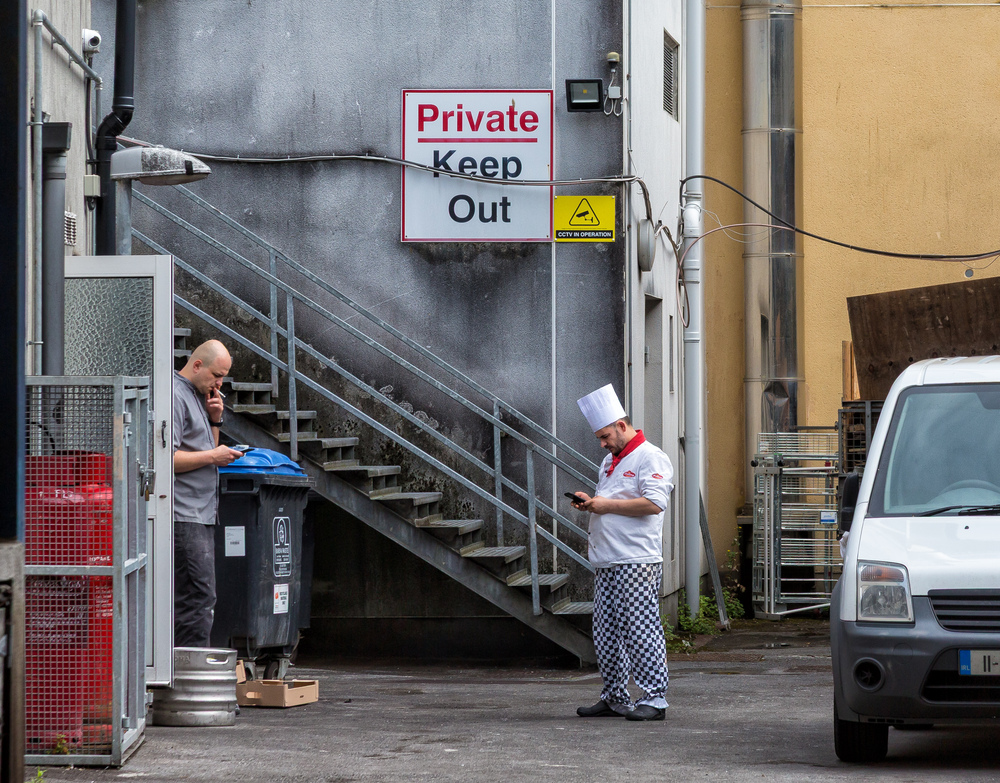 Allen Verboten und Warnungen zum Trotz hast du dich auf den Hinterhof der Restauration geschlichen, Lothar, um das Personal im Pausen- und Handymodus abzulichten. Um die Authentizität der Szene zu belegen, gibt es den Teil des Autokennzeichens obendrauf, der auf Irland verweist. Im Zentrum deiner Komposition steht natürlich der Küchenchef: Die Treppe und die abenteuerlich verlegten Leitungen führen den Blick direkt zu ihm. Ob er das Rezept für deine Bestellung gefunden hat, konntest du intra muros sicher bald erfahren. Klasse Street!