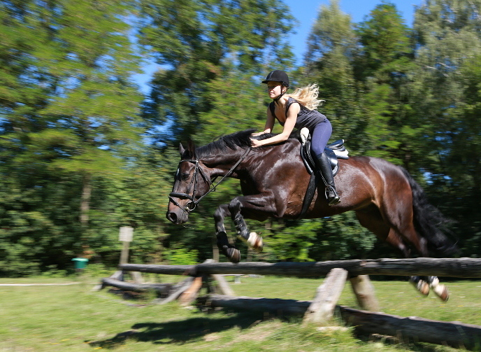 21.08.2012Für 1/125 Sek. sind Pferd und Reiterin schön scharf abgebildet. Gefühlsmäßig könnte der Hintergrund noch etwas unschärfer sein. Allerdings ohne sich gleich in grüner Soße zu verlieren.