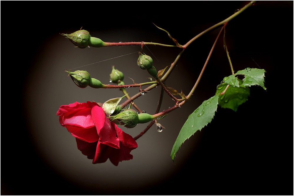 Ein wenig widerspenstig ist sie schon, diese Rose. Nicht so aufrecht, frisch geputzt und gebündelt wie wir sie aus dem Blumengeschäft kennen. Eher etwas frech hängt sie an einem langen Trieb direkt über den Weg, nach einem Regenguß so tief, daß sie mir direkt ins Gesicht klatscht, wenn ich nicht aufpasse. Aber vor dem dunklen Hausflur strahlt sie wunderschön in der Sonne. So möchte ich sie fotografieren.