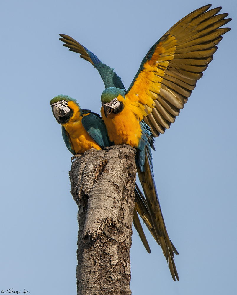 der Gelbbrustara ist mit seinen 80-90 cm neben dem Hyazinthara und dem Grünflügelara der kleinste von den 3 verschiedenen Arten die ich hier aus dem brasilianischen Pantanal zeige. Sie bilden immer Paare, daher sieht man diese Art auch nur zusammen fliegen oder aber oft auf Baumwipfeln