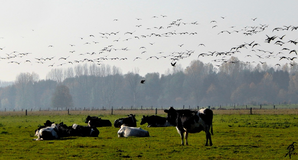 03.11.2015Ein irres Gefühl wenn die Wildgänse über Dich hinweg fliegen aber die Kühe lässt das kalt....sehr gutes Foto !