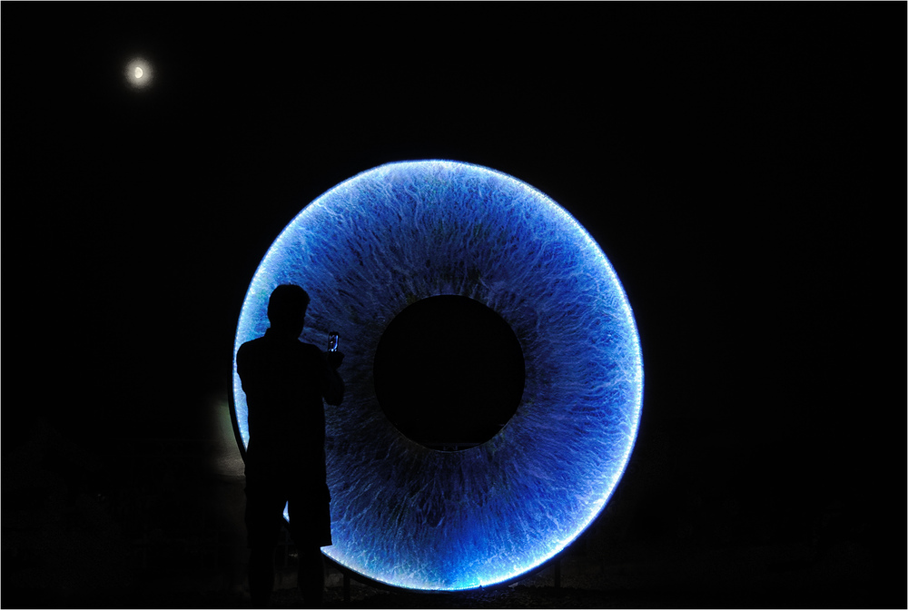 13.01.2016Ich hatte auch zuerst gedacht, wir blicken in ein riesiges Auge. Du zeigst hier ein tolles Bild, lieber Herbert, denn mit der Person davor und dem kleinen Mond oben drüber verstärkst Du die außergewöhnliche Wirkung des Lichtobjektes. Sehr gut gemacht!