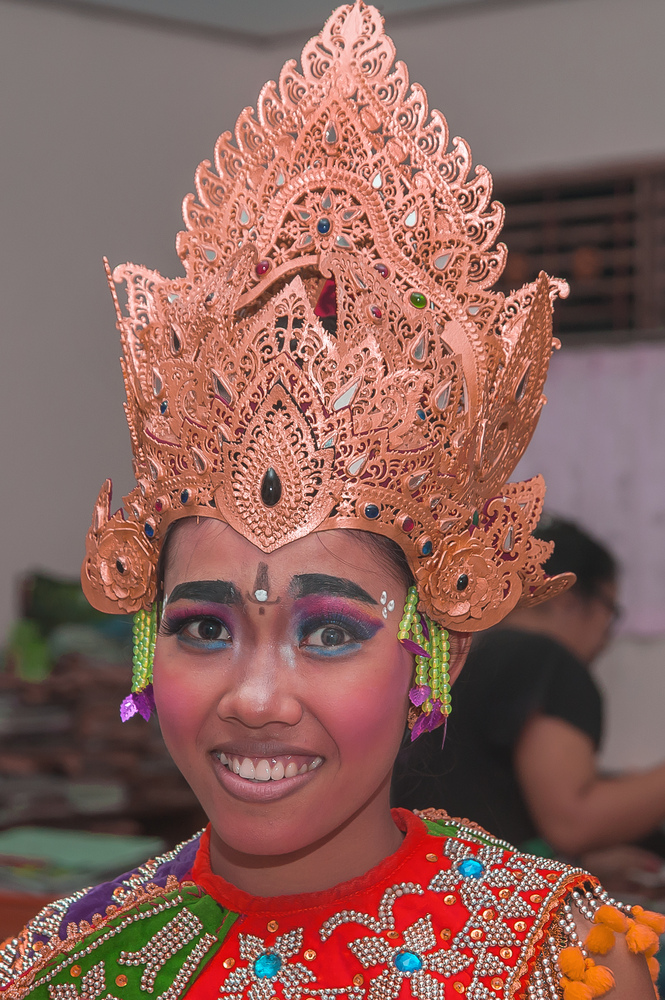 Gek Adii ist 16 Jahre alt und bereits eine großartige balinesische Tänzerin. Hier verkörpert sie Vishnu, eine der wichtigsten Formen des Göttlichen im Hinduismus, kurz vor ihrem Auftritt. Das Mark an der Unterstirn bezeichnet man als Ajna, das dritte Auge. Es ist als "Befehlschakra" dem Gehirn zugeordnet und ist der Sitz des Geistes.Intuitives Wissen und höchste Erkenntnis werden durch diese Ajna, dem Sitz ursprünglicher Macht und der Seele, erlangt.