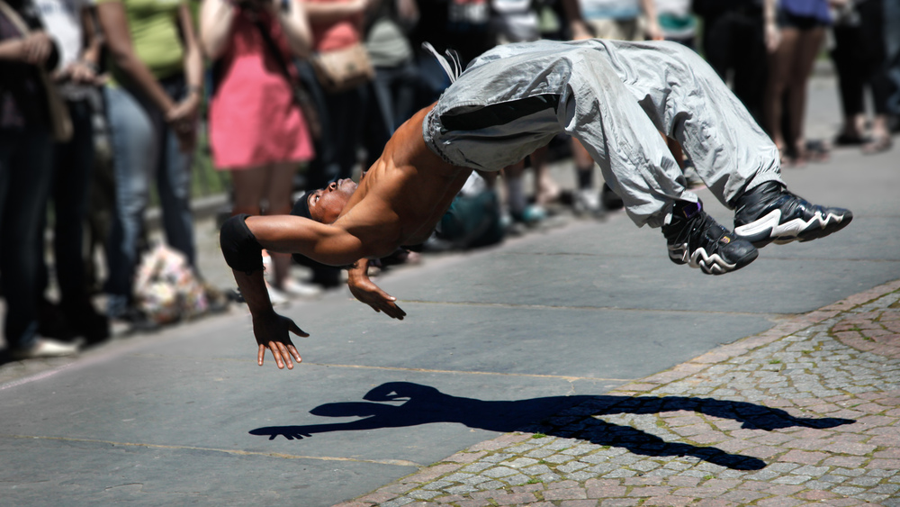 31.05.2016Den hast du gut erwischt. Vor allem das Schattenspiel, das bereits an seinem Ellenbogen unter dem Schutz beginnt und wie ein Wegweiser zum Schattenriss auf dem Pflaster führt. Die Blende gut gewählt und für grösstmögliche Freistellung gesorgt, wenn man bedenkt, wie nahe die Menschen am Strassenakrobaten stehen. Gefällt mir gut.