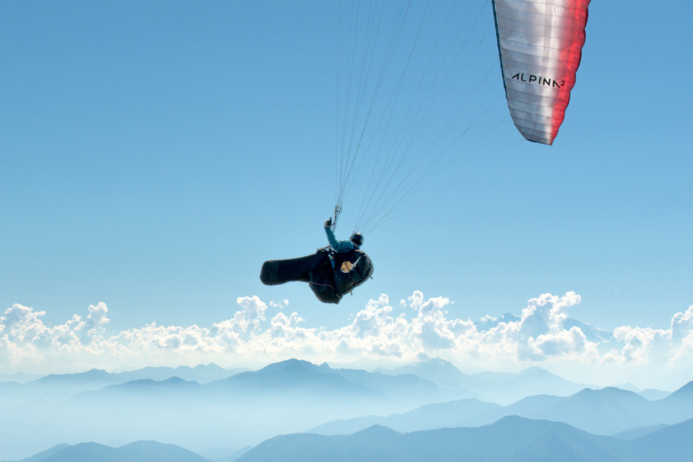 05.07.2016Lieber Guy, hier hast Du alle Möglichkeiten eines Gipfelaufenthalts fotografisch festgehalten: Das spektakuläre, plakative Bergpanorama in Orange bis Blau, das obige Bild mit dem (natürlch spontan festgehaltenen) in der Luft schwebenden Deltaseglers* bis zu dem fast monochromen Panoramabild mit den blauen Gipfeln im Bodennebel. (*hätte man nicht besser platzieren können!)