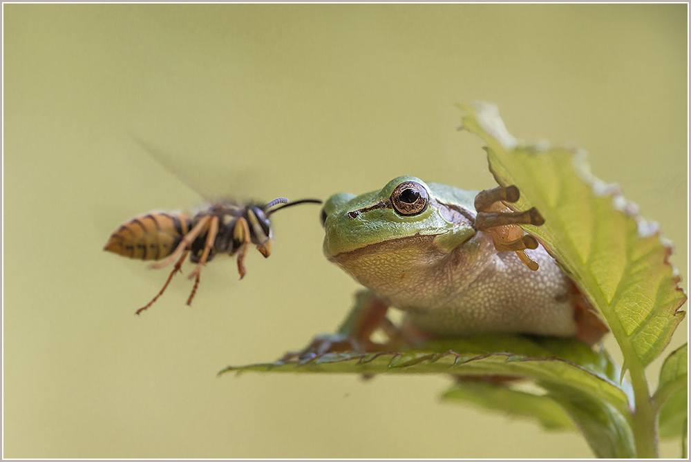 03.09.2016Ich weiß ja nicht, ob Laubfrösche Bienen fressen. Es sieht so aus, als ob sie direkt in ihr Verderben fliegt.