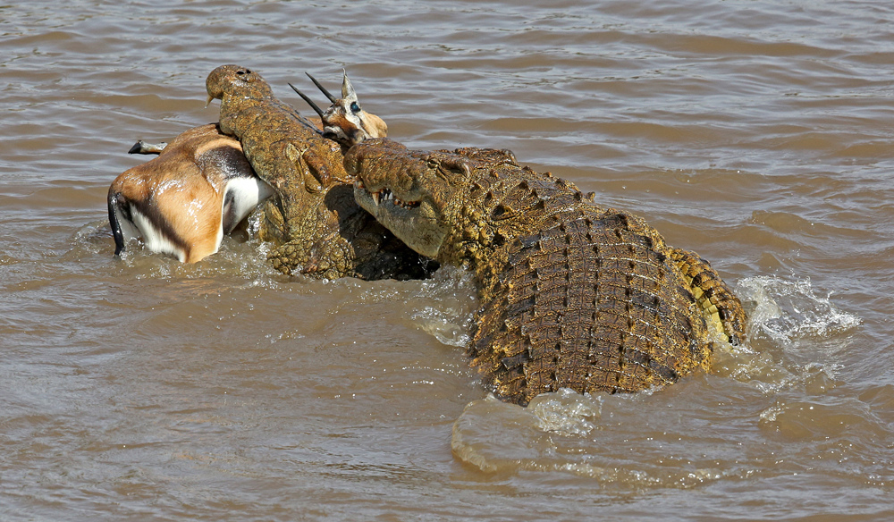 Bei einem Crossing am Mara River von Thompson Gazellen hatten die Krokodile leichtes Spiel. Ungewöhnlich war für mich, dass einige Artgenossen nicht selbst auf Beutefang gingen sondern versuchten dem anderen die Beute ab zu jagen. Das hatte ich vorher noch nicht gesehen.