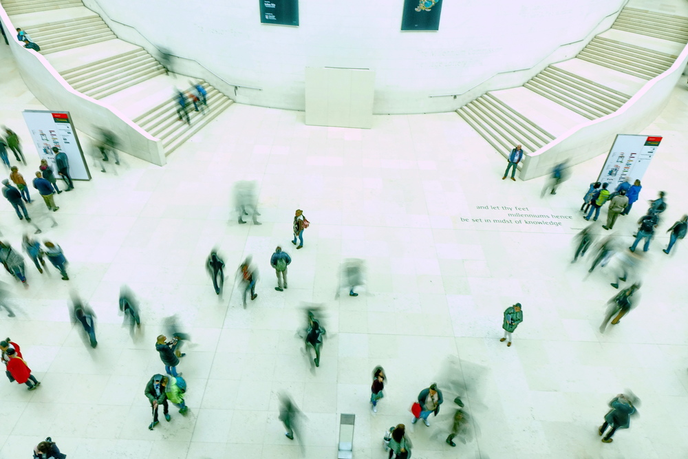 Die Aufnahme entstand in der Eingangshalle zum British Museum in London. Durch Veränderung des Kontrasteumfangs kamen die verwischten Bewegungen besser zum Ausdruck;