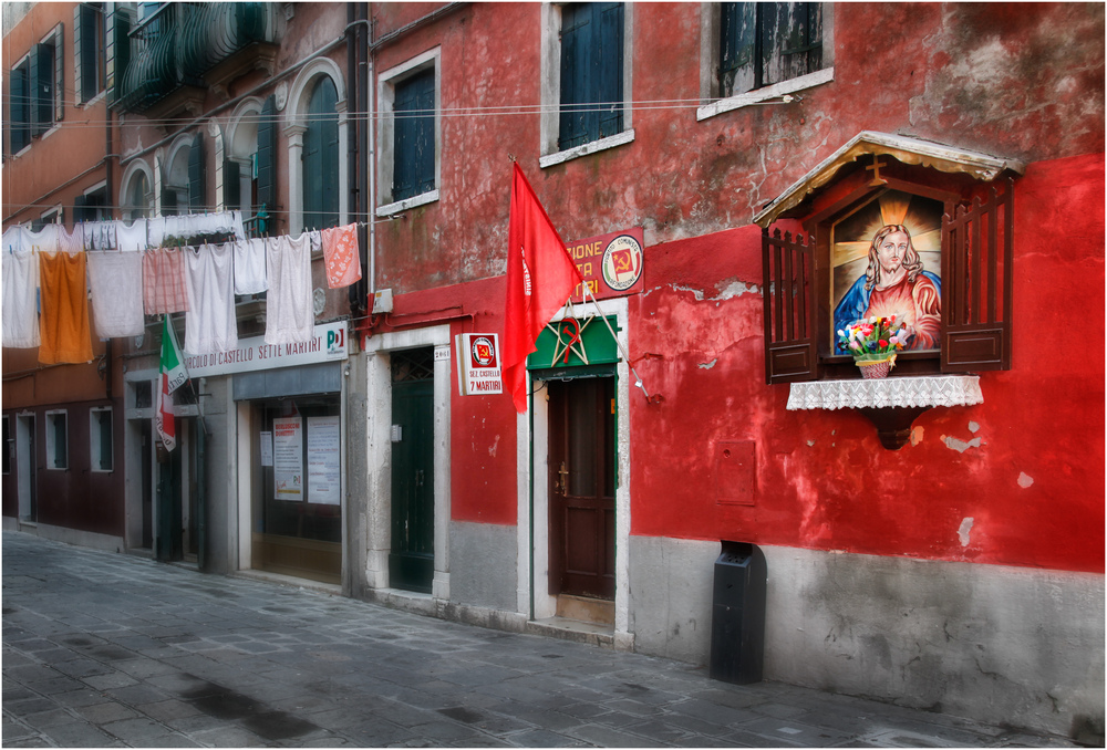 31.10.2016Eine solche Koexistenz gibt es nur in bella italia, doch da wird wohl auch noch viel "dreckige Wäsche" gewaschen werden. Auch wenn weit und breit weder ein Gläubiger noch ein Parteimitglied zu sehen ist, wirkt die Szene auf Grund der starken Rottöne sehr lebendig. Ein tolles Dokument italienischer Wirklichkeit.