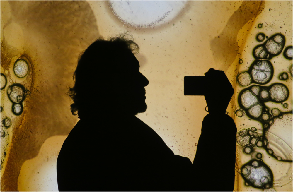 Meiner Eitelkeit gehorchend hier eine andere Version. Zur Erklärung: Ich befinde mich Strahlengang der Projektion. Da sich die Kamera neben mir befindet, kann ich gar nicht sehen, was ich da treibe.