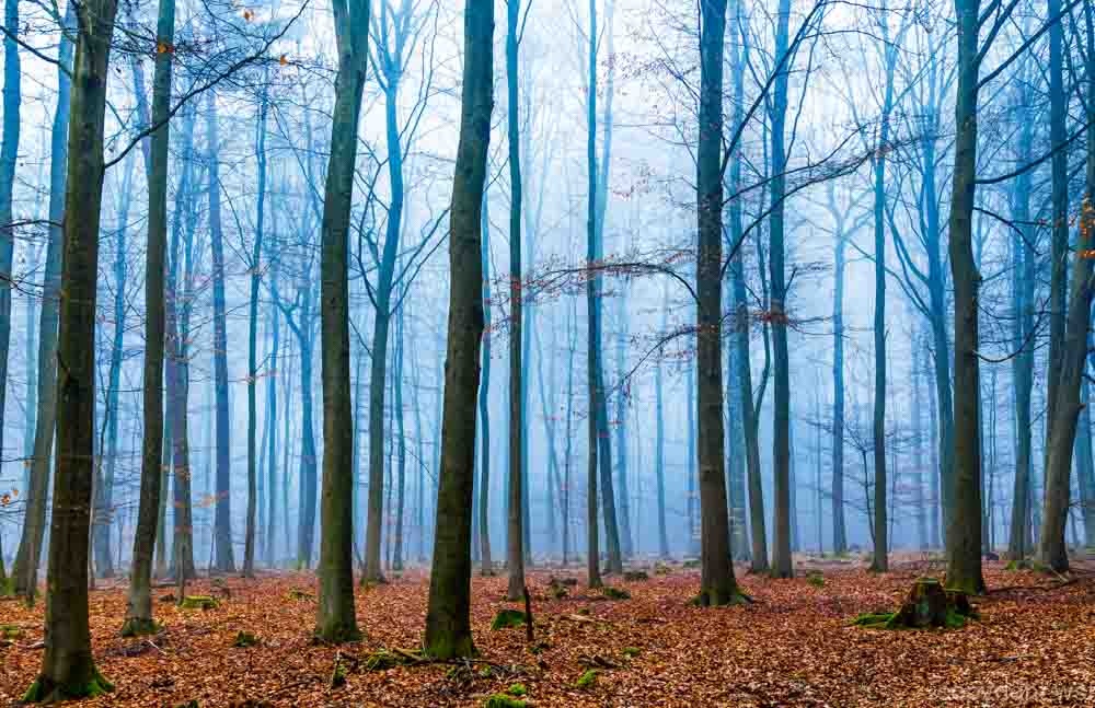 „Magic forest in fog in blue and orange“