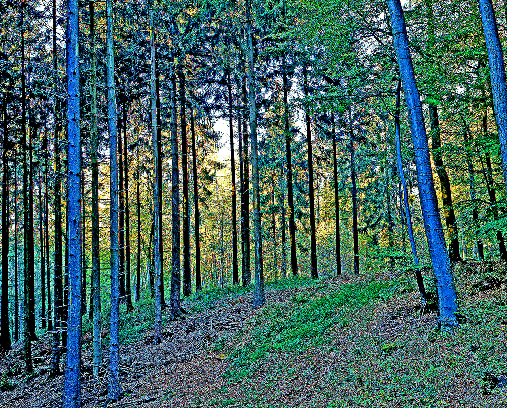 Diesen Fichtenwald habe ich einige Kilometer von meinem Wohnort entfernt gefunden. Die Bildwirkung beruht auf dem Sommerlicht, daß den Wald durchstrahlt und die Bäume zum Aufleuchten bringt. Die Aufnahme erfolgte mit der analogen Mamiya 7/2 und dem 4/80 mm Normalobjektiv bei Blende 16 vom Stativ auf 50ASA-Diafilm von Fuji