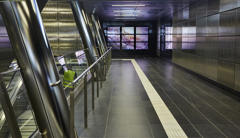 Der Künstler wählte sehr kühle Materialien, so daß die Fahrt von A nach B zu einer Reise durch fremde Welten werden kann, in denen Raum und Zeit aufgehoben scheinen.
