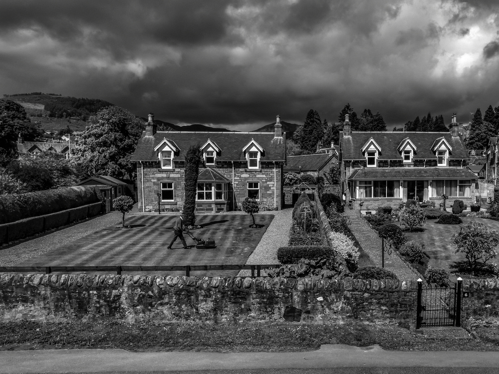 Schnell noch den Rasen...eh das alles runterkommt , ein herrliche Szene in kompletter Grautonpalette plus strahlendem Weiß und tiefstem Schwarz , in der Lupe noch eindrucksvoller !!