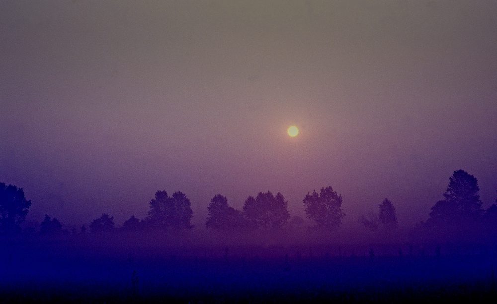 Bei einer morgentlichen Autofahrt im Herbst ist mir diese lippische Kulturlandschaft ins Auge gefallen. Das Bild wirkt durch den Morgennebel, der von der Aufgehenden Sonne durchdrungen wird. Das Foto entstand mit der analogen Nikon F3 und dem 2,8/135 mm Teleobjektiv bei Blende 16 vom Stativ auf 50ASA-Diafilm von Agfa