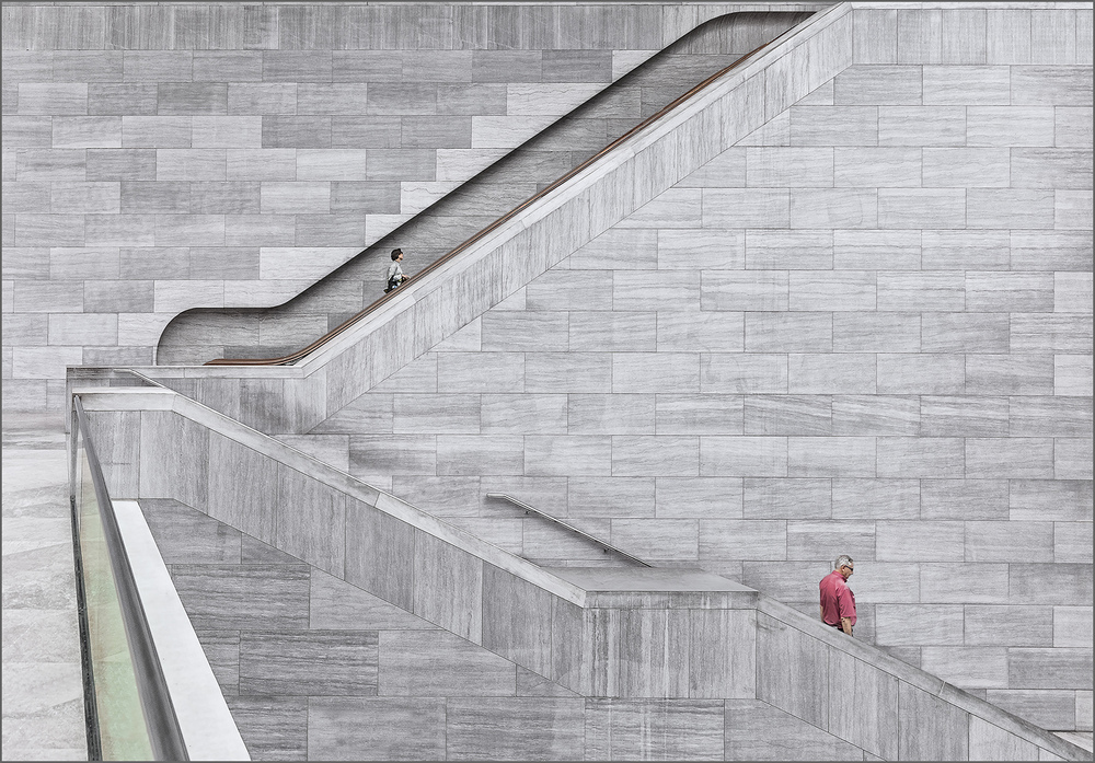 Zu Recht wie ich finde. Radikal minimalistisch angelegt spricht das Bild nur über Linien und Muster, wenn man einmal von den beiden Personen absieht. Die Blickführung ist somit für den Betrachter einfach und durch die Bildgestaltung klar geregelt. Natürlich folgt man nach Bild eintritt durch die Diagonale links unten unweigerlich den beiden Treppen, ohne sie ganz nach unten oder ganz nach oben zu Ende zu gehen. Abgebremst wird man durch die beiden, die in diesem Bild mehrere Funktionen übernehmen. Einmal markieren sie die Größenverhältnisse und zeigen ein anderes Mal die Richtungstendenzen der Treppen auf. Zumindest der Mann rechts bildet auch einen Farbtupfer, der dem überwiegend grauem Bild gut tut und zur Auflockerung beiträgt. Gleichzeitig markieren die Personen aber auch einen dramatischen Mengenkontrast zwischen unbeliebter Fläche und menschlichen Körpern.