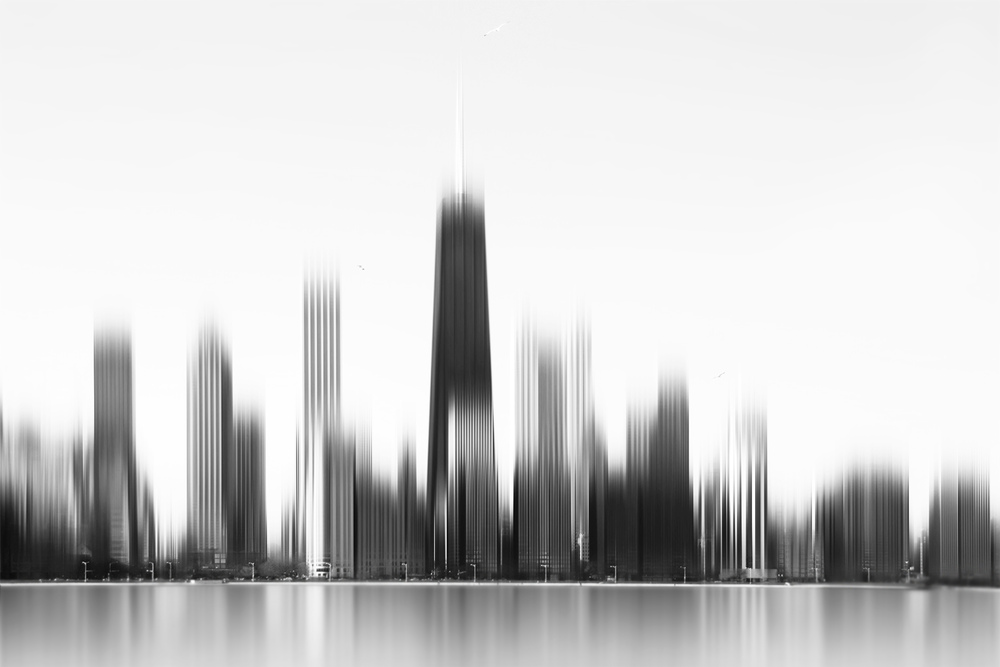 Sehr edel kommt die Skyline in diesem Motiv daher, vom Wischeffekt, dem angedeutet gespiegelten unteren Teil bis zur s/w Gestaltung ist ein sehr spannendes Bild entstanden!