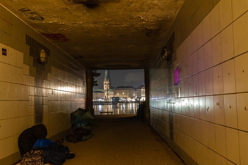 Ein alter Tunnel in dem Obdachlose schlafen. Der Blick durch den Tunnel geht auf die Alster und den Noblen Jungfernstieg. Arm trifft auf Reich.