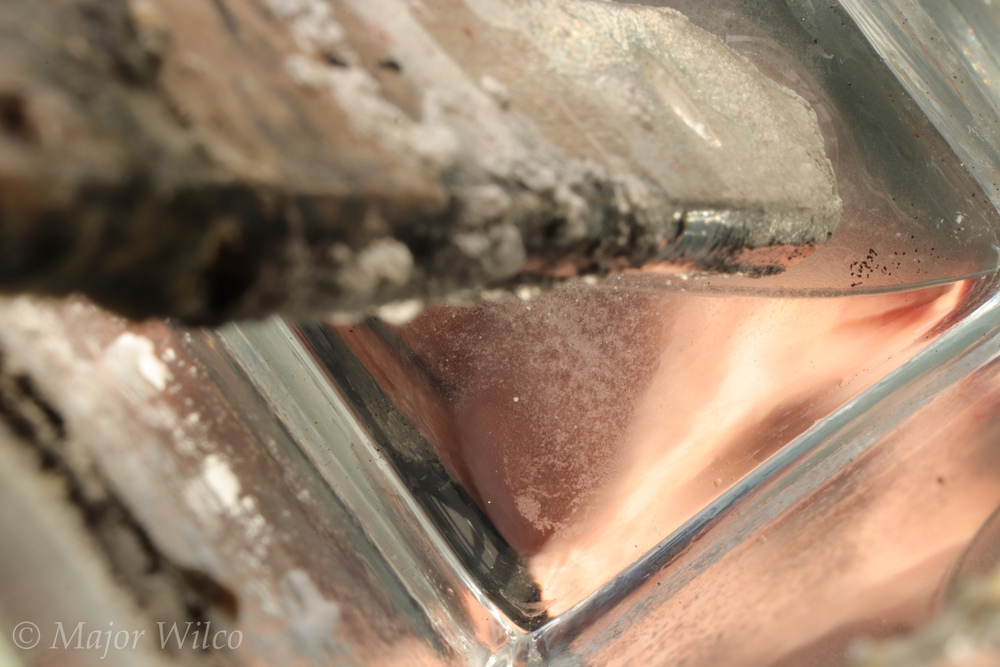 Tischinstallation mit Blumenvase und patinierten Pinselstiel. Ich wollte eine Situation herstellen die an ein abstrakt gemaltes Bild erinnert. Tiefe und Lichtmodulation waren mir auch wichtig. Aber erst mit der Idee die Finger unter der Vase mit einzubeziehen hat es wirklich spannend gemacht... der Kontrast zwischen dem kühlem Glas und den warmen Hauttönen. Daraus ist eine neunteilige Serie entstanden.