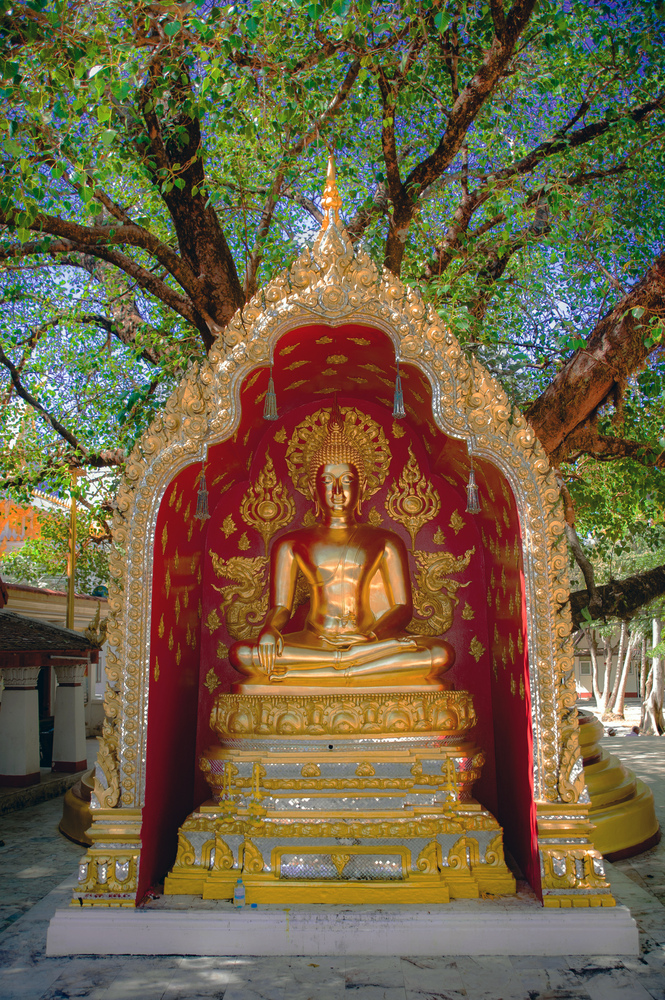 Direkt hinter der Chedi-Mauer befindet sich dieser auffällig sitzende Buddha, der von sieben Naga-Schlangen geschützt wird. Davor zeigen mehr als ein Dutzend weitere Buddha-Bilder viele der Positionen, die in der buddhistischen Kunst üblich sind. Gewöhnlich sitzt hier sonst ein Mönch, der die Besucher mit Weihwasser segnet und weiße Fäden um die Handgelenke bindet.