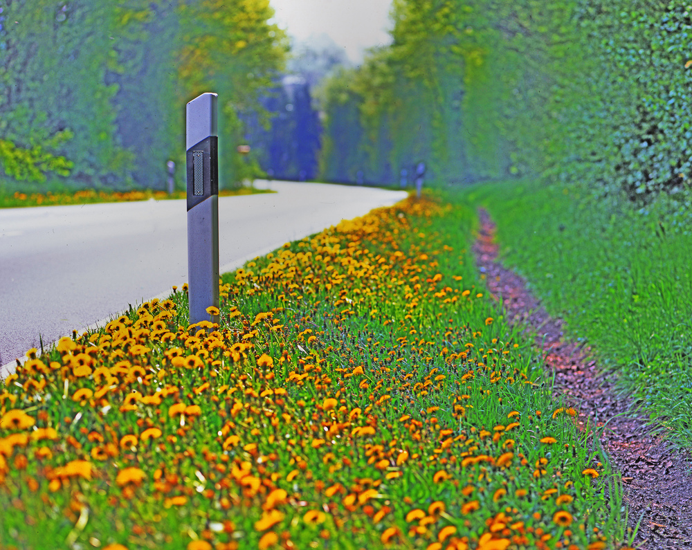 Am Straßenrand der Straße nach Alverdissen ist mir dieser Pfal am Wegesrand ins Auge gefallen. Das Bild wirkt durch die bunten Farben des Löwenzahn. Ich habe bei nahezu offener Bende den Pfal mit meiner mamiya RZ67 und dem 4,5/180mm Teleobjektiv aufgenommen. Nur der Pfahl sollte scharf abgebildet werden, während der Rest in Unschärfe verschwimmen sollte