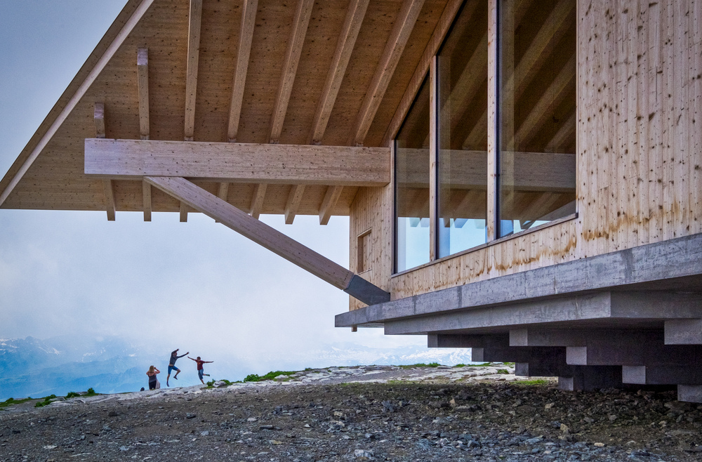 Das Gebäude vom Herzog de Meuron sitzt auf dem Chäserugg im Toggenburg (Schweiz) und strahlt durch seine elegante Holzkonstruktion.