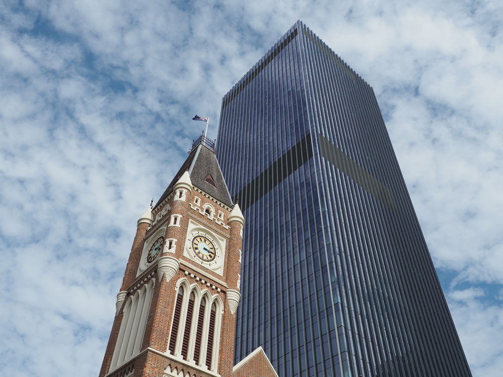 Das Rathaus von Perth (Perth Town Hall), gebaut von Strafgefangenen im sogenannten 'Victorian Free Gothic Style' zwischen 1867 und 1870, war einmal das höchste Gebäude der Stadt. Heute verschwindet es fast zwischen den Bürotürmen der City.