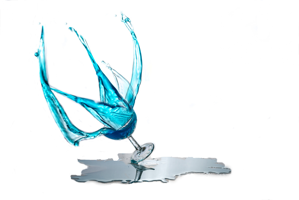 Aus mehreren Einzelfotos erstellte Scenerie. Das größte Problem stellte das Fallenlassen des Glases immer aus gleicher Höhe aber immer mit anderem Winkel dar.
