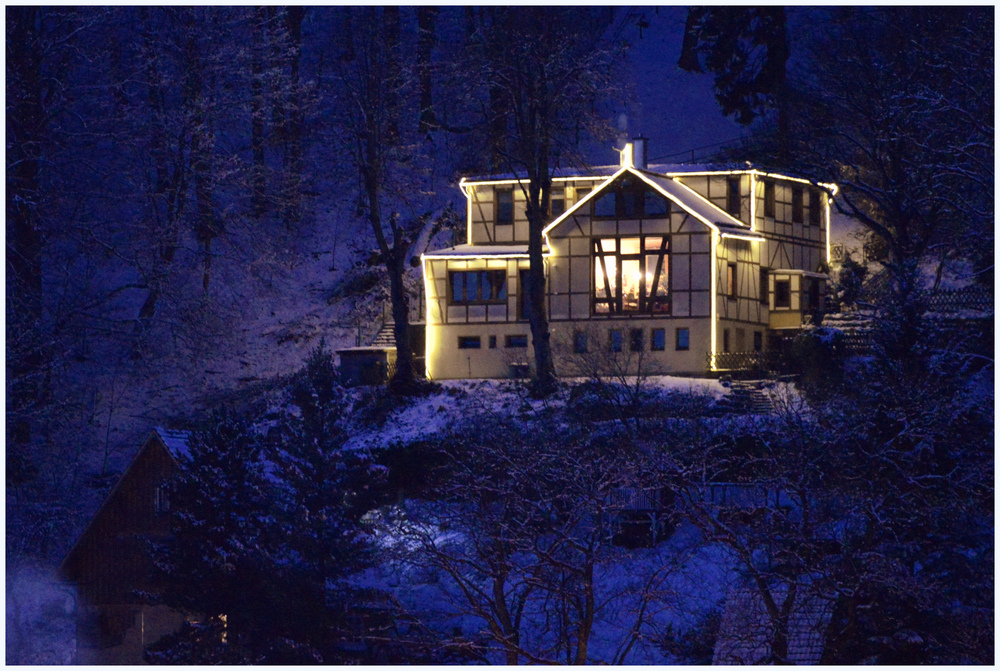 Märchenhaft diese intensive Blaue Stunde, das beleuchtete Haus umgeben von Bäumen und Schnee. Lb Gruss von Margot