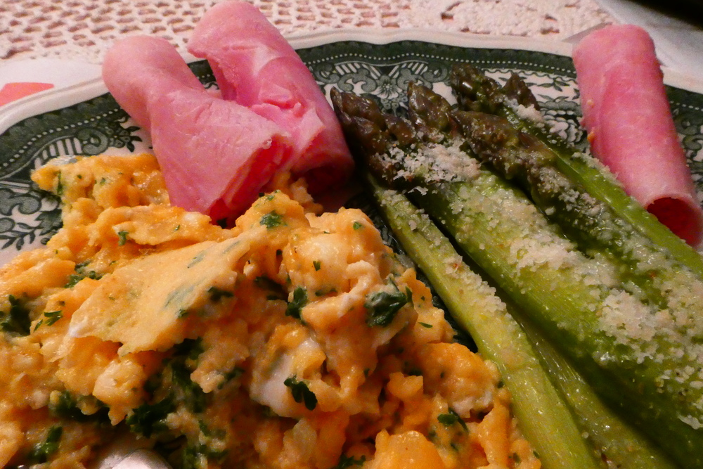 „Grüner Spargel m. Olivenöl beträufelt, m. Parmesan bestreut, dazu Kräuterrührei“