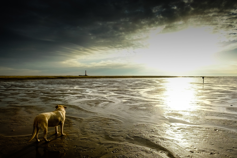 Die Farben rufen eine tolle Stimmung hervor und ich finde den Hund im Bild sehr passend. Ohne den Hund wäre das Bild ein wenig langweilig. So hat es was und hebt sich ein wenig ab. Schön, wie das Fell des Tieres so golden leuchtet. Auch die kleinen Pfützen, die sich eine chaotische Bahn durch das Watt suchen, mag ich. Am Horizont dann das Festland und der Leuchtturm. Es sieht nach einer richtig schönen Landschaft aus dort.